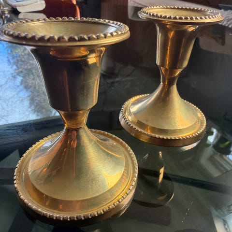 Messinglysestaker selges samlet for 190 kroner (høyde ca 9 cm). K12. Fraktkostnader: PostNord - 69 kroner. Betaling via vipps.