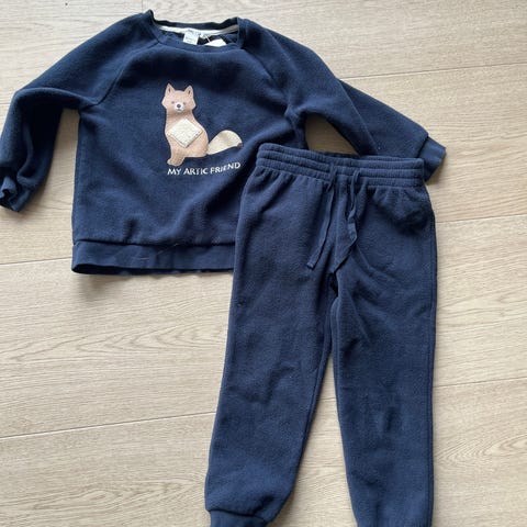 Matchende sett i myk bomullsjersey. Genser med rund hals med knapper og joggebukse. Mummifigur på mage og rumpe.