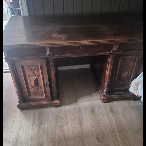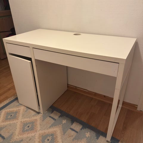 Eldre IKEA galant hjørneskrivebord med bordplate i tre og grått metallunderstell. Bordet har en ergonomisk utforming som gir stor og god arbeidsflate.