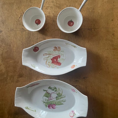 4 deler av hver type er ubrukt i eske. 2 frokostasjetter og 2 middagstallerkener er uten eske, men ikke synlig brukt.