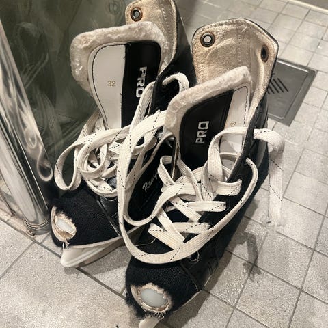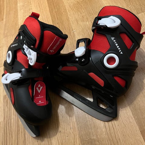Skøyter. Skøytene har justerbar størrelse og er utstyrt med snøring og stropp for god passform. Fargene inkluderer hvit, blå og svart. Størrelse 30, 31, 32 og 33
