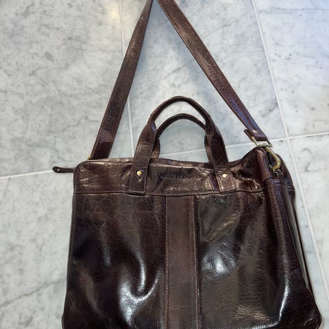 Tysk pent brukt kvalitetsveske merke JOST. Klassisk design og super til PC, jobb eller fritid. Solid stoff og kul oransje farge på innerfor. Praktiske lommer inn- og utvendig. Praktisk håndtak i utvendig «rygg» på vesken. Mål 38 cm beedde og 28 cm høyde. Noen få bruksmerker på innsiden av veskelokk - synes ikke utvendig.