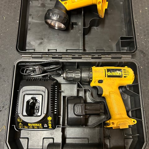 Dewalt koffert med drill, lommelykt, lader og to batterier