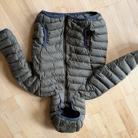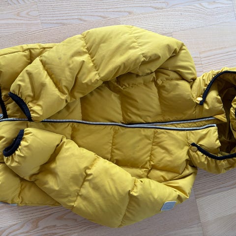 Gul Reima tykk dunjakke str 164. Pent brukt av ett barn. Den har en frisk gul farge, men på bildene ser den blass ut. Tok derfor med noen bilder der katten la seg oppå den, for da ble gulfargen litt mer sånn den faktisk er. Hetten er festet med trykknapper og kan tas av. Store, gode lommer og refleksdetaljer både foran og bak vinterjakken.