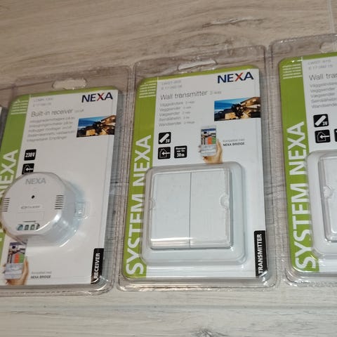 Nexa trådløs bryter og mottaker sett med flere enheter for fjernstyring av elektriske apparater. Enhetene opererer på 433,92 MHz frekvens og har CE-merking. Passer til bruk i hjem og kontor for trådløs kontroll av lys og andre elektriske enheter.