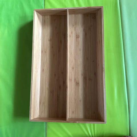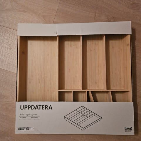 IKEA Variera bestikkinnlegg laget av bambus. Inndelt i seks rom for organisering av bestikk og små kjøkkenredskaper. Naturlig trefarge og materiale.