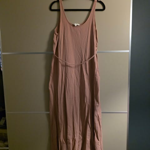 Gravidkjole fra H&M Mama med knyting i livet. Lys rosa med røde blomster, brukt som sommerkjole.