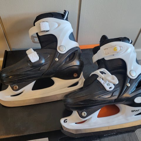 Graf justerbare skøyter i størrelse 31-34. Skøytene er brukt men i god stand. Trenger evt noen nye lisser da er er litt korte på den ene (ble kuttet litt når de havnet under skøytene ved bruk, men fungerer fint slik de er nå)