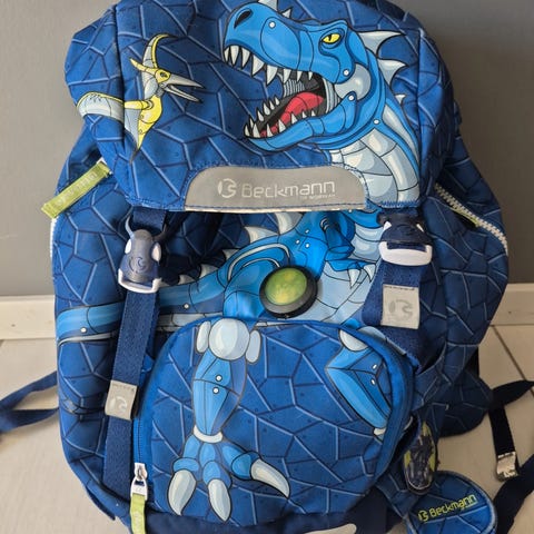 Mørk blå med blomster, perfekt fra 1. klasse. Har regntrekk med refleks. Ny pris ca 800,-