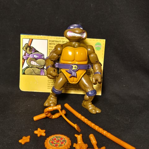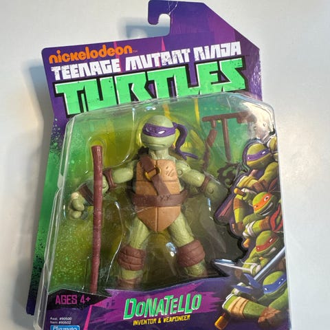 Donatello figur fra Turtles med en stav, som kan settes fast på ryggen. Den har en ikonisk øyemaske og bevegelige armer, slik at du kan skape kule positurer.