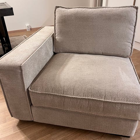 Farge/stoff er i en lys, varm beige/natur-tone, som passer godt i både moderne og klassiske hjem. Svært komfortabel stol med myke former og god sittekomfort.