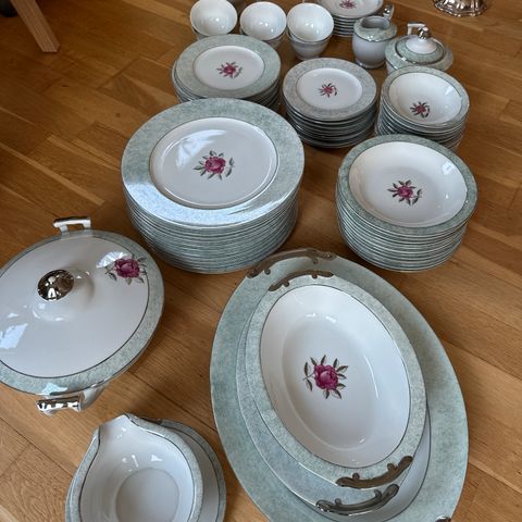 Selges med tungt hjerte. Så å si ubrukt servise sett til 12 personer. Dette settet tilbyr en omfattende borddekkingsopplevelse for spesielle anledninger og store familiemiddager, og er produsert i materialer som porselen.