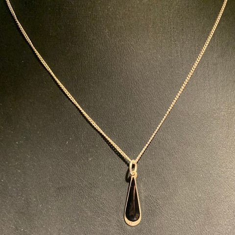 Arvegods fra tidlig 1900-tallet. Både anheng og sølvkjedet er stemplet 830s. Anhenget er ca 40x25 mm stort og sølvkjedet er ca 44 cm i omkrets.