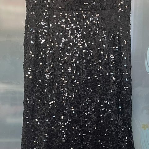 Vintage festkjole i størrelse M, svart farge og laget av polyester. Kjolen har dekorative detaljer og tynne stropper, egnet for kvinner. Måler 43 cm i livet. Stretchy