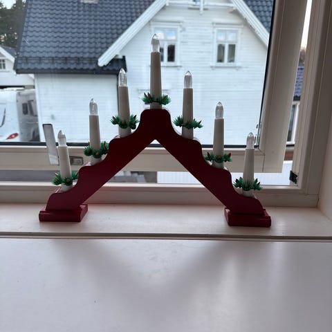 Lysestakene er dekorert med samme jutesnor, grangrener og klassiske juleelementer (klokke, bær).