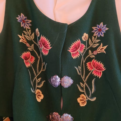 Selger en pent brukt Nordlandsbunad i ca str 44. Den som har brukt bunaden er 172 cm høy. Lengde på bunad fra skulder til enden av stakken er 138 cm. Bunaden selges med bunadsskjorte, veske, forkle og sølv (2 søljer + mansjettknapper).