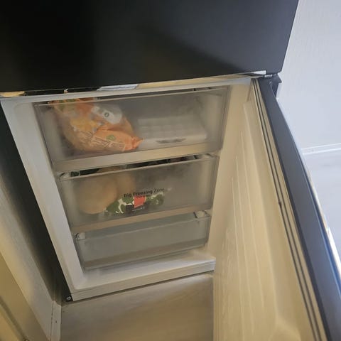 LG Kombiskap med kjøle- og fryseseksjon. Hvitt utseende med digitalt kontrollpanel på fronten. Flere hyller og skuffer i kjøledelen, samt fryseseksjon med separate skuffer for oppbevaring.