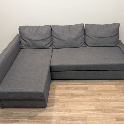 Selger en lite brukt sovesofa 160x90cm sofa, med liggeplass på 140x200cm. Har to løse ryggputer og oppbevaring under for dyne og pute. Den fungerer helt fint, men må stå beint pga delvis knekt feste (se bilde). Kan demonteres i mindre deler for flytting. Ingen husdyr eller røyk.