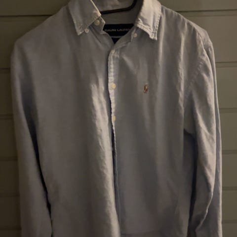 Polo Ralph Lauren skjorte i blå farge med små hvite prikker. Skjorten har detaljer i blomstermønster på krage og mansjetter. Størrelse S, designet for kvinner passer best xs/s. Pent brukt.