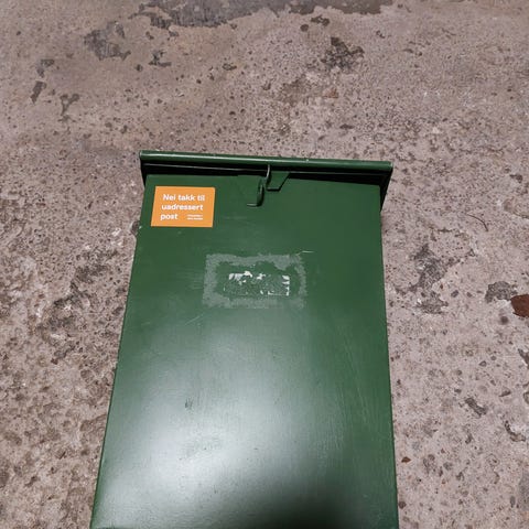 Born in Sweden mailbox with original stand. Used with visible surface wear and aging. The stand consists of two round steel tubes with a mounting plate on top. No lock, keys, ground anchors, screws, or any other mounting parts are included. Buyer must provide a new lock cylinder and suitable ground anchors that can be screwed into the tubes or used with the mounting holes under the legs. The tube ends underneath are threaded. The mailbox is functional and ready for use once a lock and ground anchors are installed. Pick-up in Bergen, shipping possible if buyer arranges it.