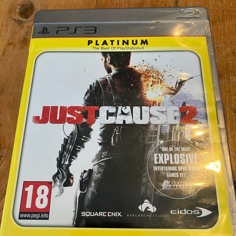 Just Cause 2 er et Playstation 3 spill med action- og eventyrtema. Spillet har en aldersgrense på 18 år og inkluderer en spilldisk og et omslag med instruksjoner og informasjon om spillets innhold og funksjoner.