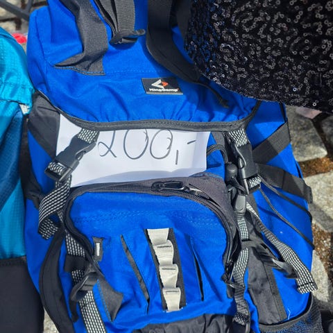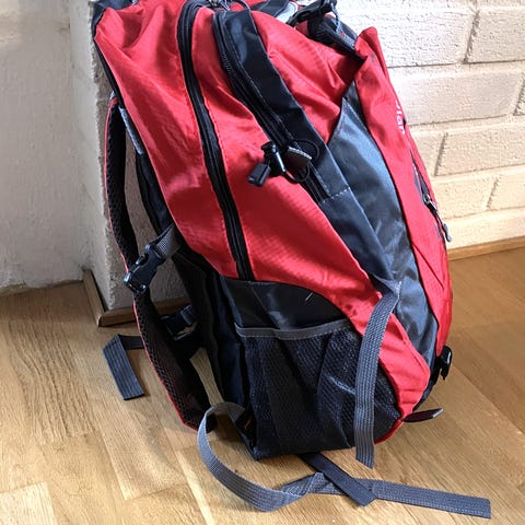 Sekken har et par flekker med hvit maling på seg, både på fremsiden og på den ene stroppen, og er litt støvete, men er ellers i nokså god stand :)