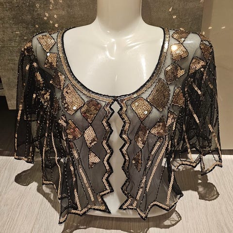 v-hals foran og hel knappestolpe innfor volangene, plissering avslutter nederst i en liten bue