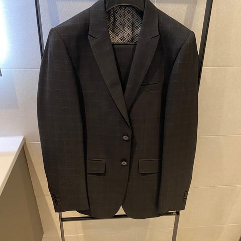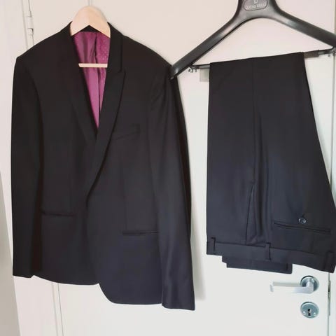 Jakke i størrelse 48 og bukse i størrelse 32 (waist). Dressen er laget av polyester og har en veldig god passform som sitter pent på kroppen. Kun brukt en gang. Nypris 5 990 kr.