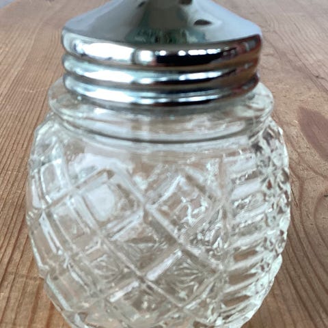 GLASS- 1 MEGET FLOTT salt bøsse med metall skrulokk. Kraftig spiralformet glass. Høyde 6,3 cm, veier 165 gram. Bredde ca 5 cm. Spiralformet mønster på glasset som gir et dekorativt preg. Lokket har hull for jevn dryssing av salt. Står «S» for salt, øverst på metall lokket. Passer til bruk på kjøkkenet eller middagsbordet. Glassbeholderen har ingen skade, eller slitasje. MEGET FIN!! Se alle bildene fra mange forskjellige sider. Den kan sendes, eller hentes her i Sandfjord, eller avtale henting i Tønsberg på Tolvsrød.