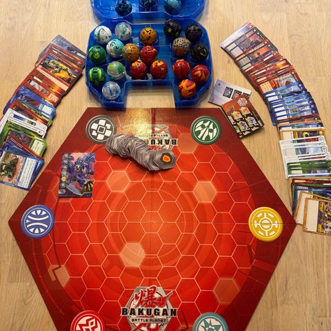 Bakugan oppbevaringsboks med plass til 20 kuler i ulike farger og mønstre. Boksen er laget av plast og har lokk med Bakugan-logo. Egnet for oppbevaring og transport av Bakugan-kuler.