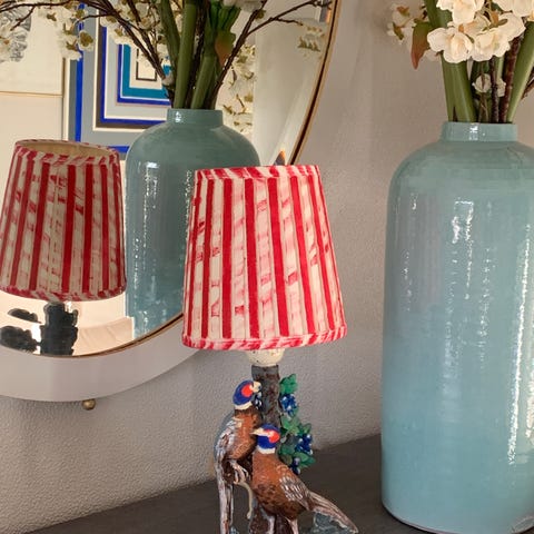 Lampen er laget av tre og håndmalt med barnesikker maling. Hver enkelt lampe er unik, ettersom de lages for hånd og på bestilling.