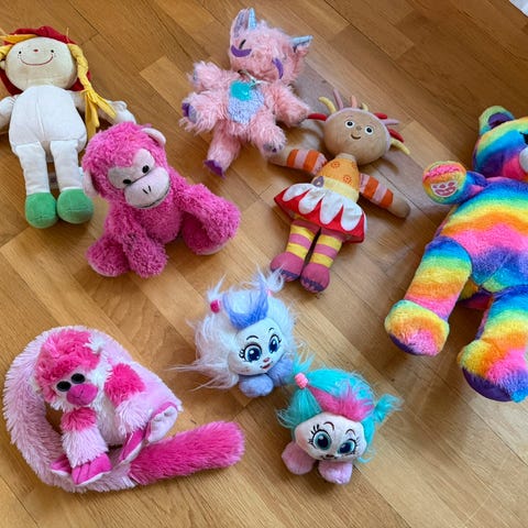 Heklet kanin bamse laget i mykt garn med brunt og lilla farge. Passer som myk leke eller dekorasjon.