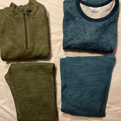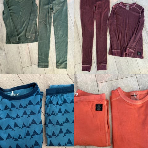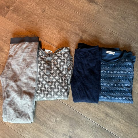 4 longs (Wool exclusive) og 4 trøyer (3 Wool Exclusive, 1 Janus) i 100% merinoull. Alt pent brukt, ingen bruksmerker, hull eller flekker. Selges helst samlet. Noen par ullsokker følger med om ønskelig (34-36).