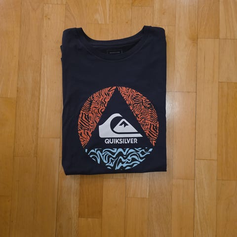 Quiksilver skjorte i flerfarget mønster, størrelse L for herre. Kortermet design med knappelukking og brystlomme.