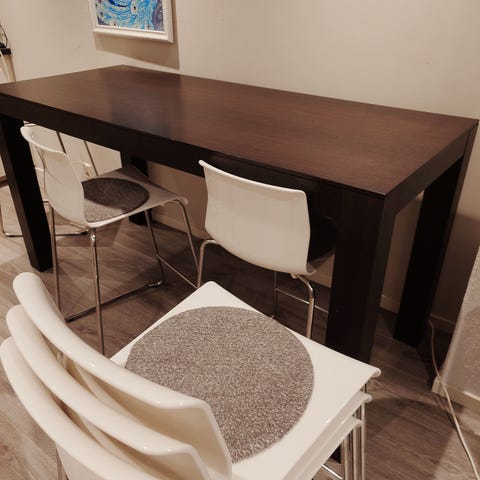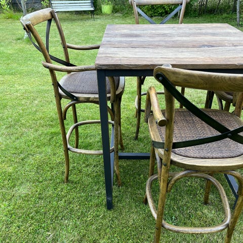 Pent brukt barbord med fire stoler. Bordet er av merket Stornas, og barstolene er av merket Henriksdal (sittehøyde 74 cm). Begge fra IKEA, kjøpt i 2019.