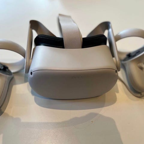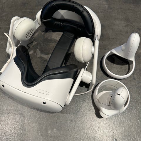 Oculus Quest 2 VR-headset i hvit farge. Inkluderer VR-briller og to håndkontrollere. Trådløst design for virtuell virkelighet-opplevelser.