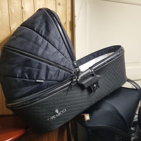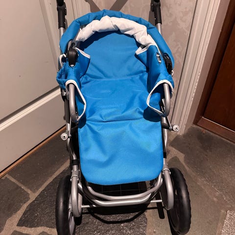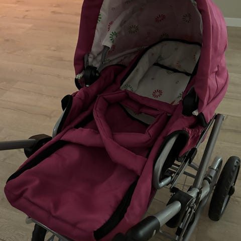 BRIO dukkevogn. Dukkevognen har justerbart håndtak og avtagbar bag. Kan legges sammen.