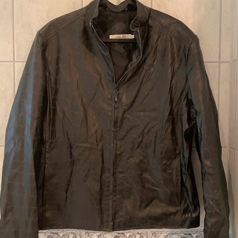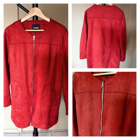 Stilig kort jakke i imitert skinn. Flott skinnkant rundt krage og rundt armene.
