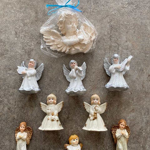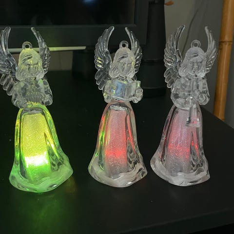 To dekorative englefigurer i klar akryl/plast med innebygd LED-lys. Lyset skifter farger (blå, lilla, rød m.m.) og gir fin stemningsbelysning.