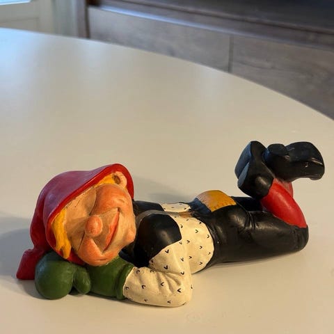 En rosa nisse laget av keramikk som er 20 cm høy