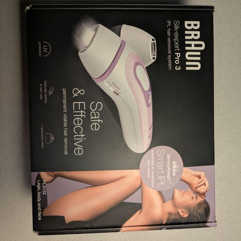 Braun Venus IPL hårfjerningssystem med brukerhåndbok og aktivatorcelle. Enheten er designet for hjemmebruk og tilbyr IPL-teknologi for hårfjerning.