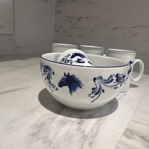 Jeg selger deler fra hestesportens porselensserie med det karakteristiske blå hestemotivet.