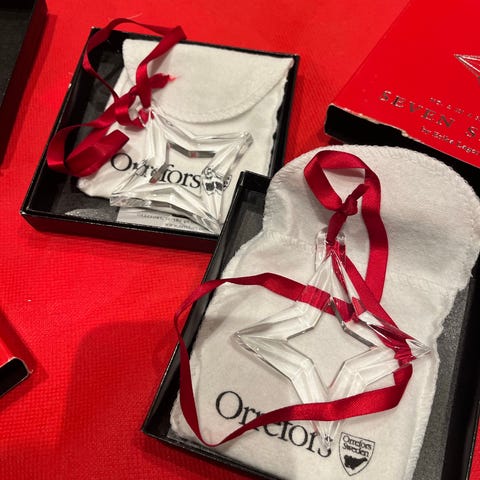 Snøfnugg og stjerne fra Räder Desig stories selges. Disse er nye/ ubrukte i eske. Porselen med bånd og perle i tre. Selges samlet.