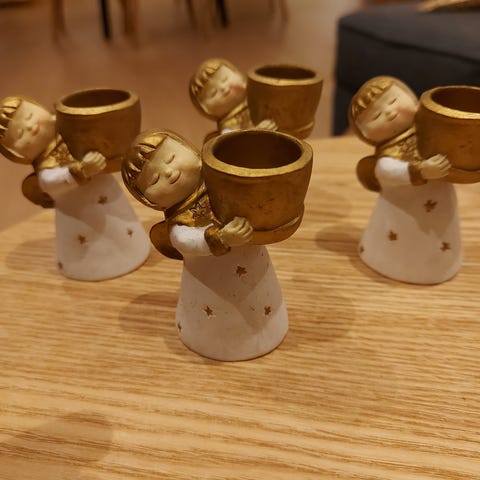 3 nydelige engler selges samlet for 150,- De to som sitter er 14cm høy og den som sitter på kne er 17cm. Kjøper betaler frakt eller henter på Kallak❄️