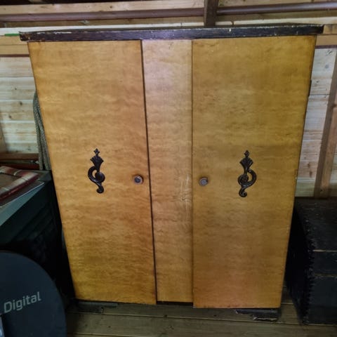 Garderobeskapet er tredobbelt/ tre dører/adskilte rom. Står tørt i kjeller og er brukt til arb.klær, regntøy etc. Hadde planer om å bruke metallskapet på badet, lage hyller inni, men skal flytte og har ikke plass lenger. Må hentes. Skapet er tungt, ta gjerne med en bærer:)