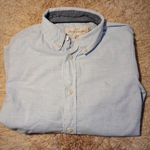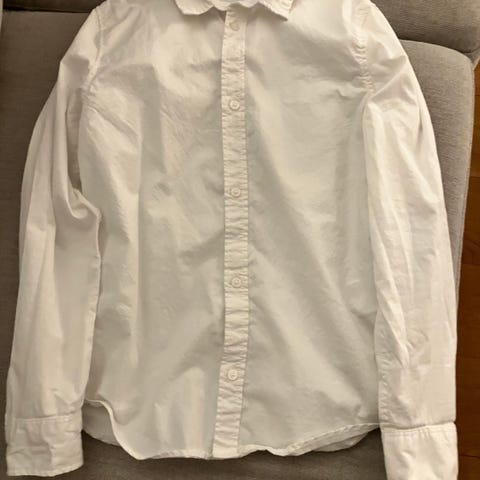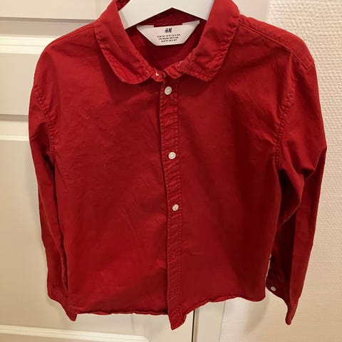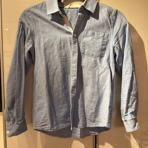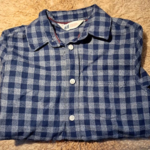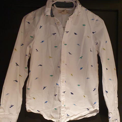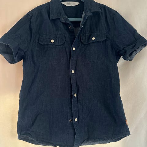 H&M unisex skjorte i størrelse 140, laget av bomull. Skjorten har grønn farge og flere dekorative merker på front og ermer. Den har knappelukking og en krage med knapp for ekstra justering.