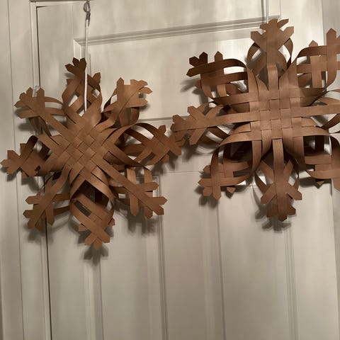 To stjerner. En med trykket mønster fra 70-tallet, 35 cm, og en hjemmeheklet, 40 cm. Begge er pene. Selges høystbydende over kr 100 samlet.