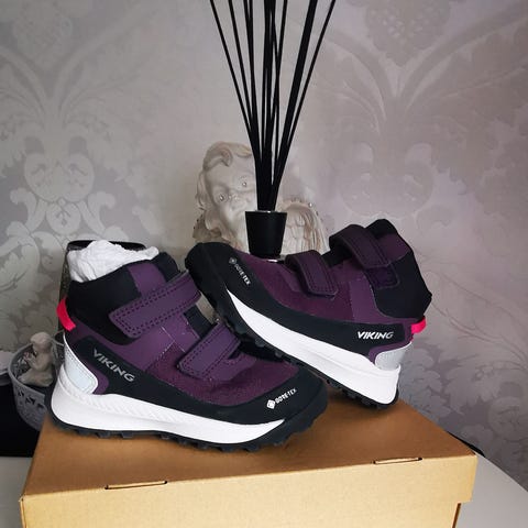 Viking Expower Mid GTX 2V barne støvler i størrelse 27, farge lilla (grape). Støvlene har vanntett Gore-Tex membran, borrelås for enkel justering, og er designet for jenter. Materialet og konstruksjonen gir beskyttelse mot vær og vind, egnet for kalde og fuktige forhold.