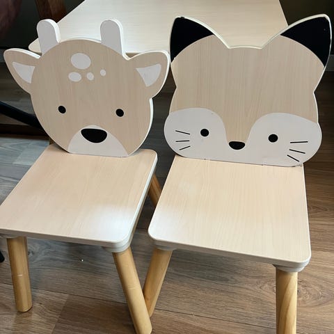 Jollyroom barnemøbelsett bestående av et rundt bord og to stoler i tre. Bordet har en rund bordplate med naturlig treutseende. Stolene har unike design med et ryggstøtteformet sete og et sete med pelslignende trekk. Møblene er egnet for barn og har en naturlig trefarge.