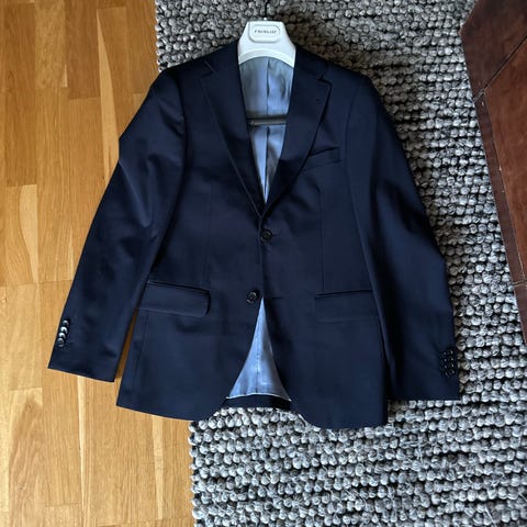 Selger flott dress brukt til konfirmasjon. På bildet er modellen ca 177cm, og dressen er meget pent brukt. Ingen slitasje, men en hempe på innsiden av bukselinningen er borte. Betyr ingenting i bruk, og vises ikke. Dressen er fra 2024. Størrelse 46 på både jakke og bukse.
